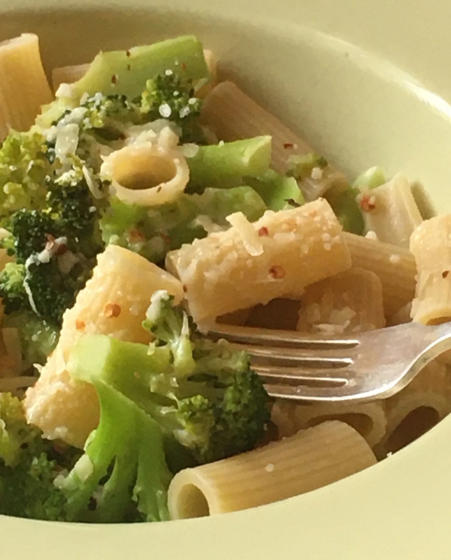 Drain the pasta when it is al dente and stir into the broccoli mixture. Transfer to a shallow soup-pasta bowl and season with crushed red pepper and Parmigiano-Reggiano.
